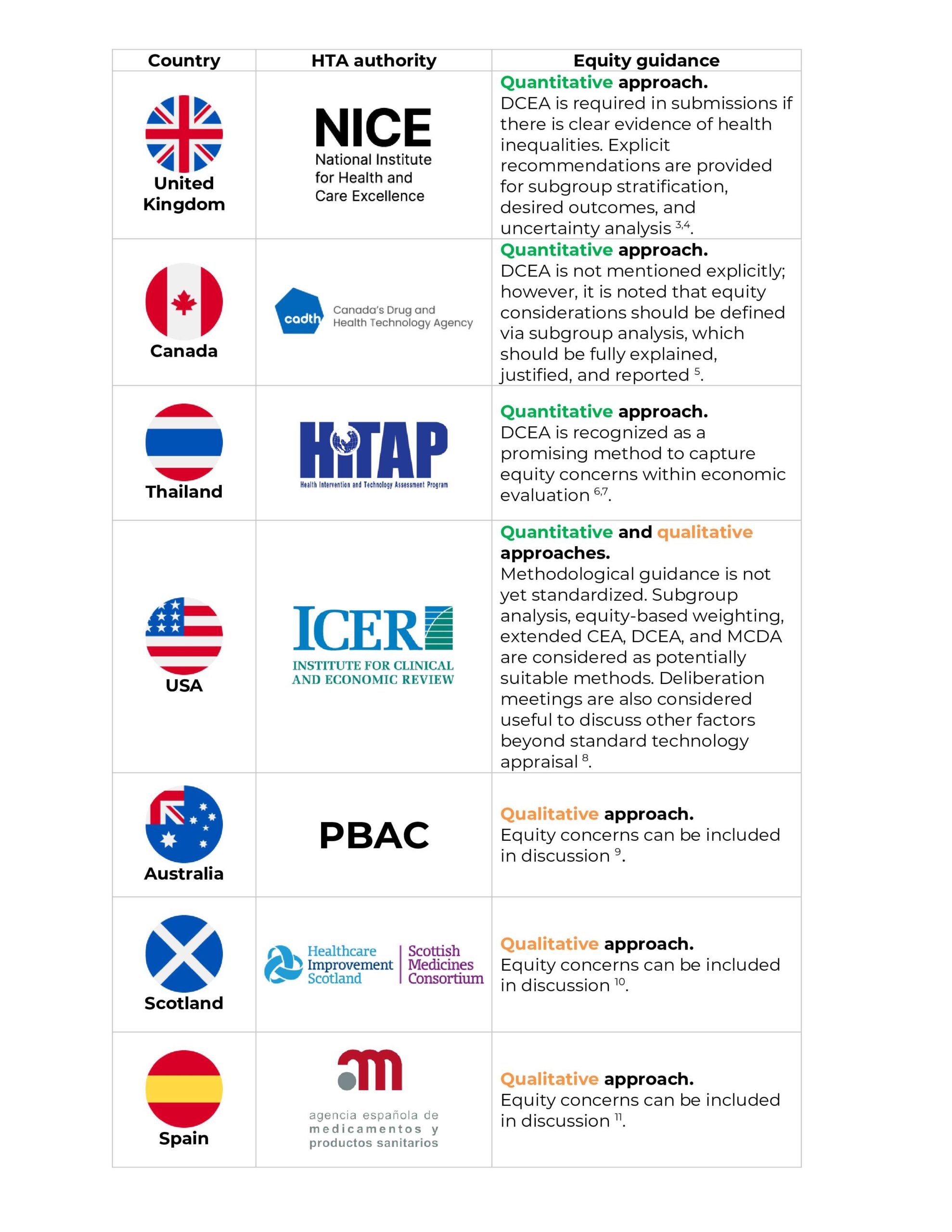 The table below summarizes the findings of a brief review of seven HTA guidelines, which explicitly outline their position on equity. The review focused on recommended approaches to equity, ranging from qualitative assessment to quantitative frameworks such as DCEA, or a combination of both.